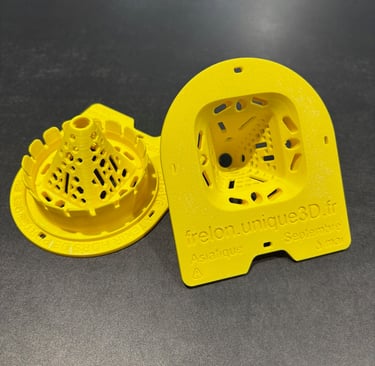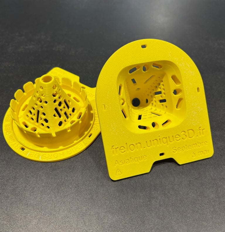 Les modèles B du piège à Frelon Asiatique sélectif se déclinent en deux versions adaptées aux contenants en verre : l’un conçu pour se fixer sur des bocaux à miel traditionnels du terroir français, et l’autre pour s’adapter à certaines bouteilles d’eau.